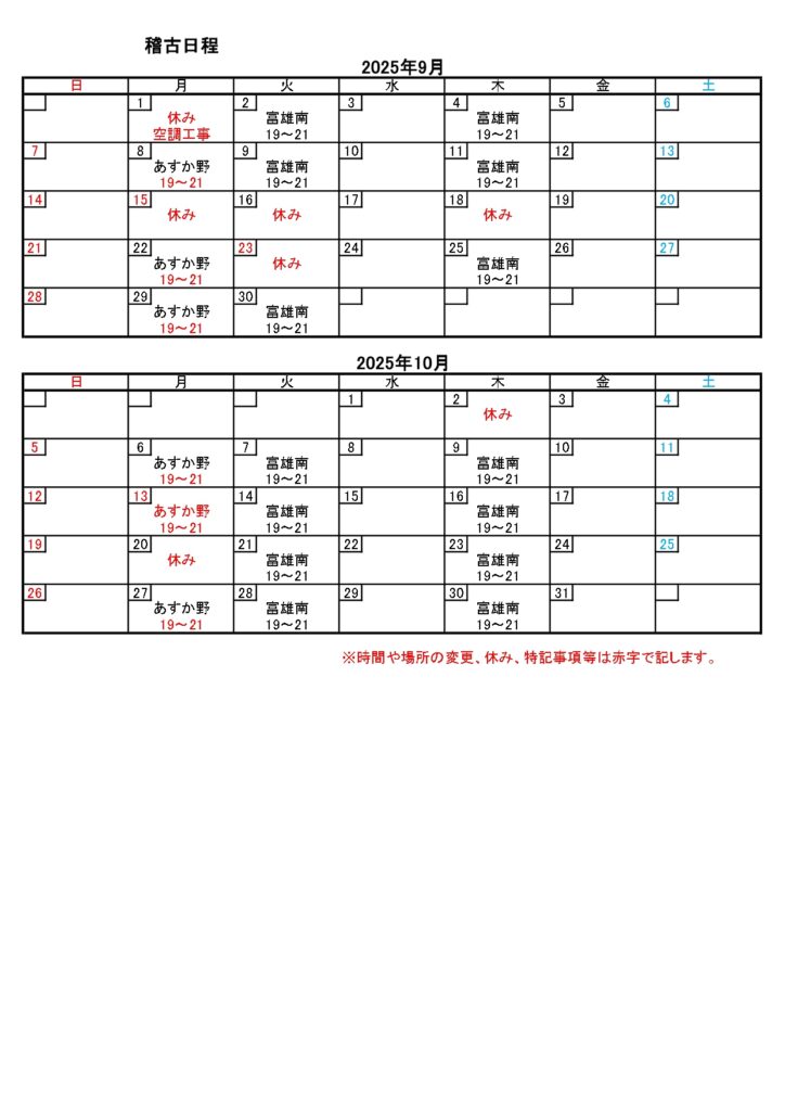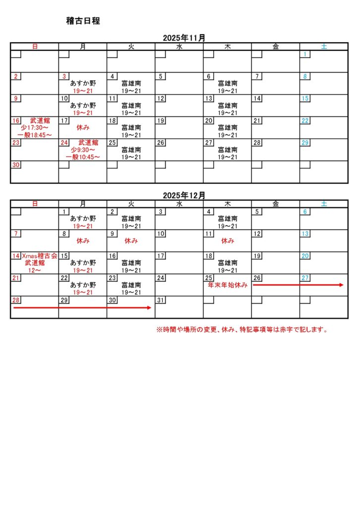 真修館 予定 2025年稽古 予定 あすか野道場について 3月3日から4月14日まであすか野道場が使用できません。 その間、生駒市武道館や富雄南道場へ場所や曜日、時間の変更となります。 スケジュールを確認の上稽古に参加するようにしてください。