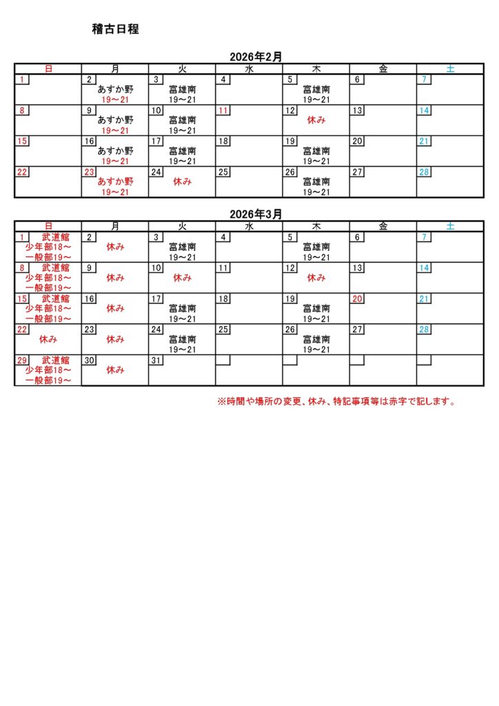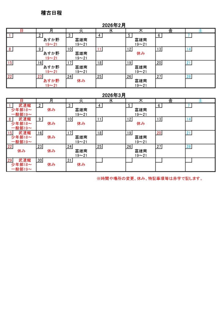真修館 予定 2026年稽古 予定 あすか野道場について 卒業式・入学式の為、3月1日から4月18日まであすか野小学校体育館が使用できません。 その間、生駒市武道館にて振り替え稽古をしますので、予定をご確認ください。